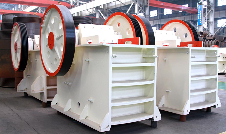 磁铁矿破碎机的结构主要包括了飞轮、偏心轴、机架、肘板、肘板后座、动颚、定颚、固定颚板、大皮带轮、活动颚板等部件。