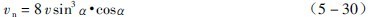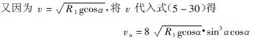 钢球落到落回点B时,其速度vp可分解为从磨机中心到落回点B方向的法向分速度vn及与筒体圆周相切的切向速度v1。法向速度vn用于冲击矿块,切向速度v1沿筒壁切线方向对矿块或矿粒产生磨剥作用。这里主要考虑钢球对矿块的冲击作用,故未考虑v1。根据戴维斯及列文松等人的理论,vn为: