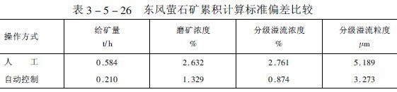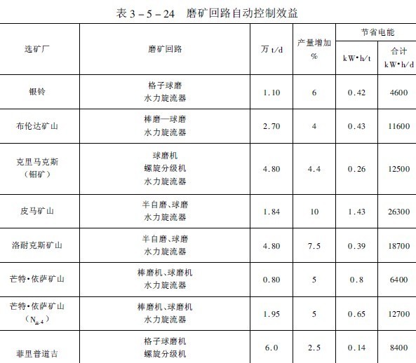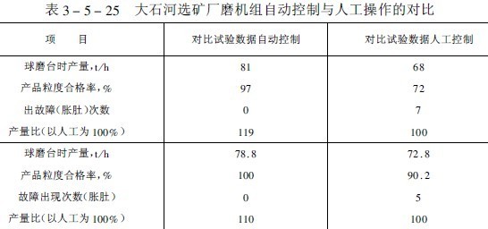 据国外报导磨矿回路自动控制可提高产量2.5-10%处理一吨矿石可节省电能0.4-1.4千瓦·时(见表3-5-24)。我国东风萤石公司浮选厂和首钢大石河选矿厂磨矿分级自动控制经验表明,采用自动控制系统时,磨矿操作的各项指标的波动范围均比人工操作小(见表3-5-25和表3-5-26)。