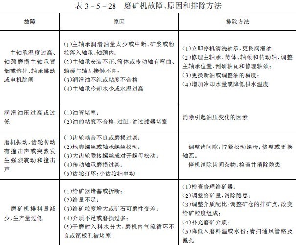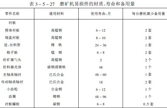 我国选矿厂生产实践中球磨机易损件的材质、使用寿命和设备用量列入表3-5-27中。常见故障、原因和排除方法见表3-5-28。在处理量大、磨机台数多的选矿厂,磨机修理工作一般都在现场进行。中小型选矿厂通常也设置检修用的起重设备。当吊车起重吨位较小时,可用两台电动或油压千斤顶辅助起重,以便对磨机进行就地检修;大型部件一般送到机修厂修理。现场修理时,需要停车一段时间,但比较经济。无论采用哪一种修理方法,在停机修理之前都应根据机组修理记事本中的记录、事故报告表、磨矿机交接班和设备检查记录,编制设备缺陷明细表,然后编制设备修理进度表;并规定各部件或机台的修理顺序及可能平行进行的修理作业。