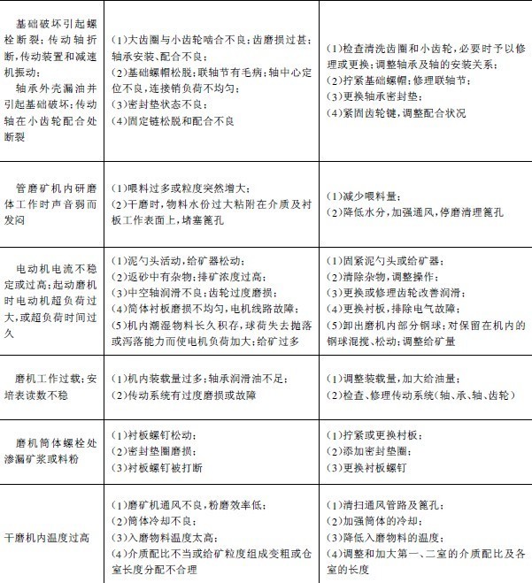 当遇到突然停电时,必须立即停止给矿和给水,并切断电源,关停其他设备。为了防止以后起动困难,用水冲洗磨矿机内部。加强日常检杏维护是减少磨机事故的重要措施。每次交接班时要检查磨机组的所有连接螺栓的紧固情况,如发现有松动的必须停车拧紧。筒体衬板螺钉如有折断应及时更换,防止擦伤筒体,或矿浆外漏。定期检查衬板磨损情况,磨到一定程度应予以换。使用油杯润滑时传动轴承中的油做大每旬更换一次:滤油器的滤网不应玷污,每隔2-3周应清洗一次;减速机6个月检查一次。介质装入量不能超过规定值。操作中如发现设备有不正常现象,应立即停机处理。经常清擦机器表面的油污,做到文明生产。