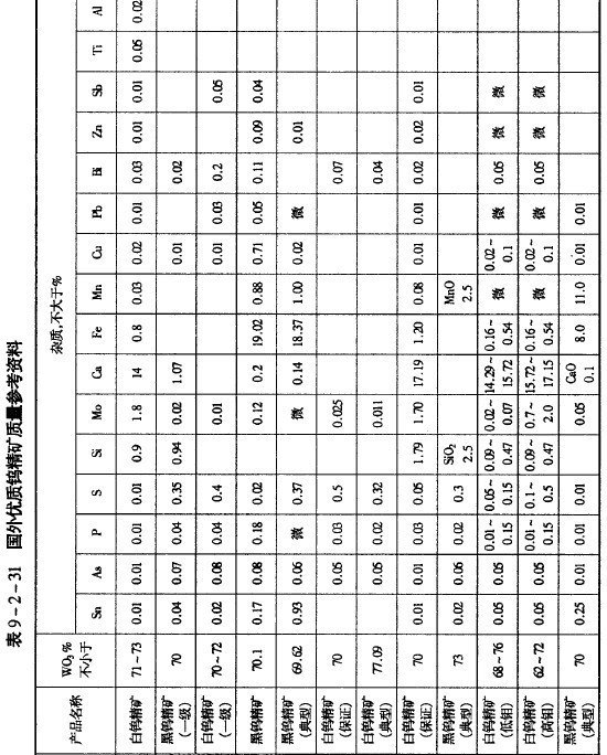 表9-2-29及表9-2-30为苏联国家钨精矿产品标准,表9-1-31为国外良好钨精矿产品标准。
