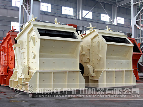 反击粉碎机是锤式破碎机的变形,主要变动有:活动锤头改为固定锤头;在机壳上正对转子锤头的切线方向装了1一2个反击板;去掉了原来的筛板。由于没有了筛板,所以其出料粒径较大,常用于粗碎和中碎,另外,该机对原料的含水率也可放宽到12%左右
