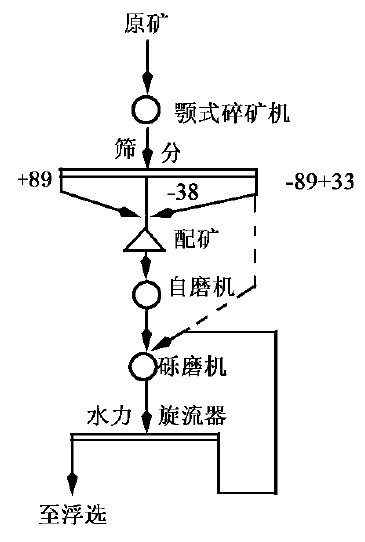 第二段磨矿,第二段磨矿为带预检分级的球磨机。这种流程的特点是可提高自磨机的处理量10%-20%,同时可提高系统的给矿晶位。例:瑞典波立登公司瓦斯堡(Vassbo)铅锌矿两段一开路全自磨流程,如图3所示。