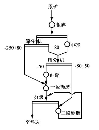 选机,目的是尽早地丢弃尾矿,这样可以大量节省磨矿费用。另外,在回路中应用了弧形筛和敲击细筛,前者用来分级,后者用作选别。例:芬兰奥托昆普公司克列蒂铜矿两段砾磨流程如图6所示。原矿经三段破碎后给入第一段砾磨机进行粗磨,粗磨的产物再进第二段砾磨机细磨。第一段砾磨机的砾介从粗碎产物中筛出,第二段砾磨的砾介从中碎产物中筛出。若第二段砾磨机的砾介消耗量大,所用砾介可从粗碎产物中筛出部分加以补充。
