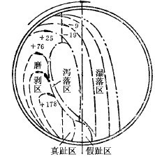 如图1所示,新给矿中的小粒,由给料端进入,沿A面均匀地落于筒体底部中心,然后向两侧扩散。大块具有较大的动能,总是趋向较远的一侧,但其中有一部分必然要和AB面相碰,然后向另一侧返回,因之,也使大块得到均匀分布。A—A、B—B 在这里的作用是防止给入物料有害的偏析。自排矿端沿下面返回的颗粒如同新给料中的细粒一样,均匀地落于筒体底部的中,然后向两边扩散。大块和细粒在筒体底部沿轴向运动,方向正好相反,于是产生磨剥作用。