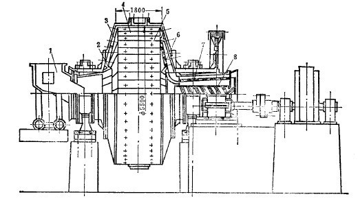 北京某矿有我国第一座采用闭路干式自磨、干式磁选工艺的选矿厂。闭路干式自磨系统如图1所示。原矿经粗碎到300-0毫米后,由皮带运输机1运到中间矿仓2,借矿石在皮带运输上卸落过程中惯性力的作用,粗细矿石产生一定程度的分级,将其分开贮存。然后用电振给矿机3把分别贮存在两个矿仓中的矿块按一定比例搭配(即偏析配比),给入自磨机5进行磨碎。被粉碎的物料在主风机10(主风机的作用是使调节好的空气流在自磨机和分级机内循环并运输物料)造成的强大风力作用下被连续排出,沿着管道进入沉降箱6进行第一次分级,较粗的颗粒便沉降下来。