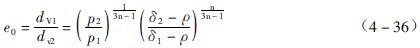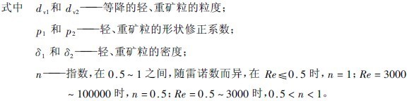小密度颗粒的粒度与沉降末速度相等的大密度颗粒粒度之比值,称为颗粒的等降比,其值大于1。可以根据沉降速度相等的关系求出。自由沉降时,在一定的雷诺数范围内,等降比e0为一常数,即: