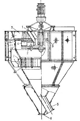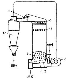另一种结构近于水力旋流器的风力旋流器,为提高分级效率,下部还供入上升气流。通过式离心分级器(见图3-4-8),主要用于与干式磨机闭路工作。设备主要由外锥1和内锥2组成,上部装有导向叶片5,使由内外锥之间上来的气流呈切线进入内锥。磨机产物与气流一起从底部管道中以大约18-20米/秒的速度向上供入,进入内外锥之间的环形空间后,因过流断面变大,速度降到4-6米/秒,于是,粗的矿粒落下,由管4中排出,返回磨机再磨。其他矿粒被气流带着往上行,经叶片5,呈切线进入内锥,产生回旋运动。在惯性离心力作用下,较粗的矿粒被抛到内锥壁上,然后下落,由排矿管6排出。这种产物或作为产品,或者返回磨机,视情况而定。细矿粒随气流从顶部管道中排出,集尘器中收集,为细粒产物。