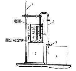 淘析法水析装置也称萨巴宁沉降分析仪,如图1所示。淘析过程是在一个直径为70-100mm、高度为150-170mm的玻璃杯1中进行的。杯内装有一根直径约为6-10mm的虹吸管2。虹吸管的短管部分应插入杯内,使其管口下端距固体沉淀物料面留有5mm的距离。虹吸管另一端带有管夹3,插入到溢流收集槽4内。
