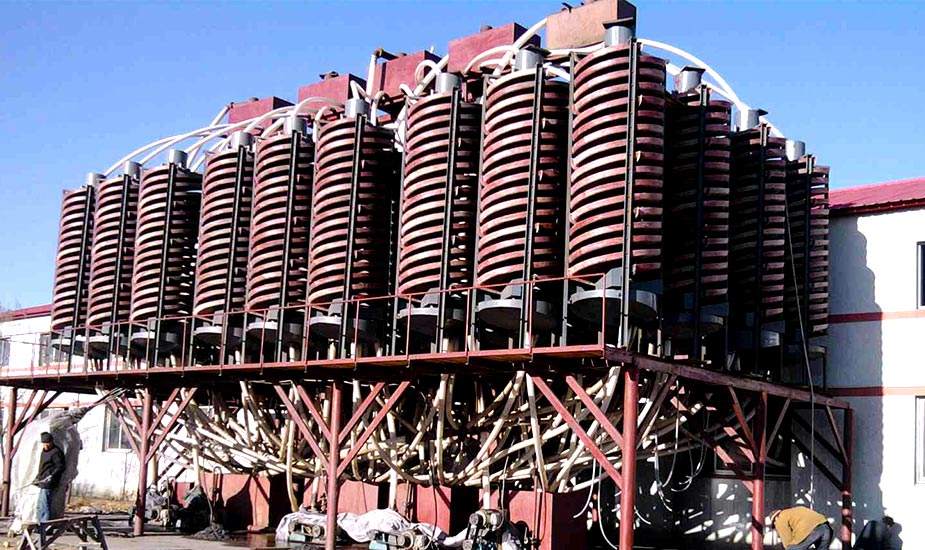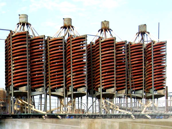 将螺旋溜槽立起,校准垂直线,用铁架或木头固定在合适的位置,由砂泵将矿砂送到螺旋上顶两个进料口处,加入补充水,调节矿桨浓度,矿桨自然从高往下旋流,在旋转的斜面流速中产生一种惯性的离心力,以矿砂的比重、粒度、形状上的差异,通过旋流的重力和离心力的作用,将矿与砂分开,精矿流入精矿斗用管道接出,尾砂流进尾砂斗用管道接到砂池,再用砂泵排走,完成了选矿的全过程。