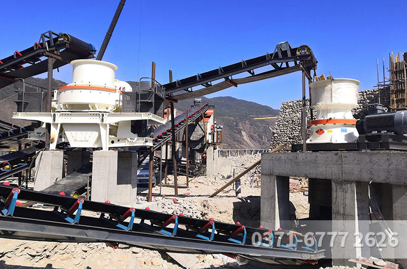 机制砂原料在振动给料机的作用下,运输到颚式破碎机进行粗碎,随后再送往圆锥破碎机进行中细碎加工;