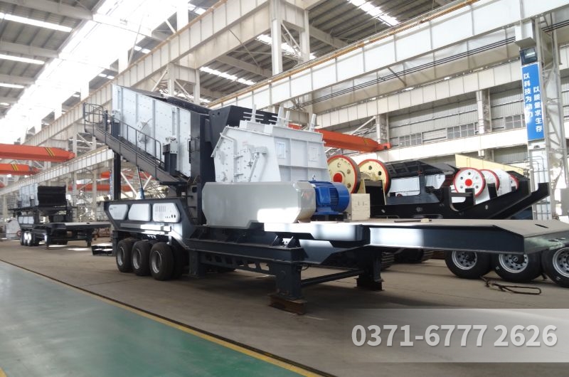 中细碎石头的移动反击破筛分机,主要由轮胎移动车、反击破、振动筛构成,可根据产量要求配置不同型号的反击破和振动,反击破中细碎矿石石料,振动筛筛分石料。