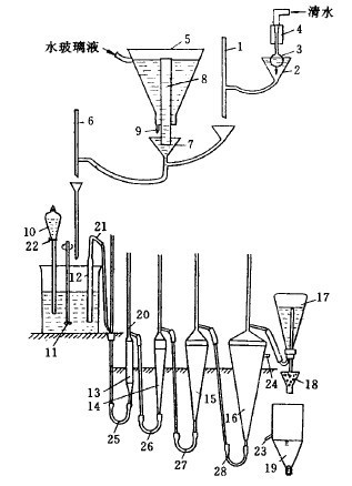这种连续水析器一次可获得多级产品,操作简便,只要保持工作正常(及时放出管内气泡且不使矿粒堵塞胶管),所得结果就较为准确,但水析时间较长。